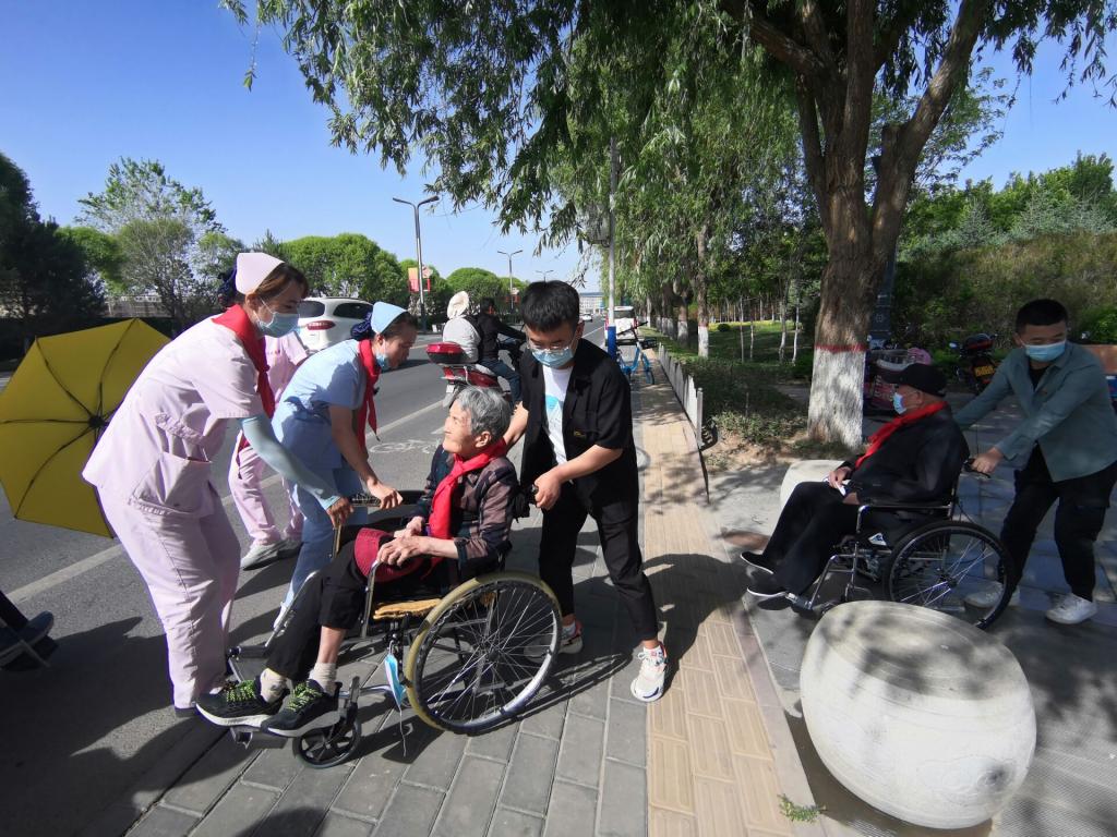 见到老人们,党员及志愿者们就忙碌了起来,大家主动地陪老人们谈心,拉家常,询问老人们的身体状况。由于受到去年全球疫情的影响,老人们已经长时间没有离开养老院,在和老人们沟通交流后,志愿者们推着轮椅,在养老中心工作人员的陪同下,带领老人们前往“芦水湾”生态公园,领略张掖优美的大自然风光,整个活动持续了一个早上,老人们在员工党员和志愿者的陪同下穿越了整个芦水湾,穿越结束后,员工们将老人安全送回养老中心。